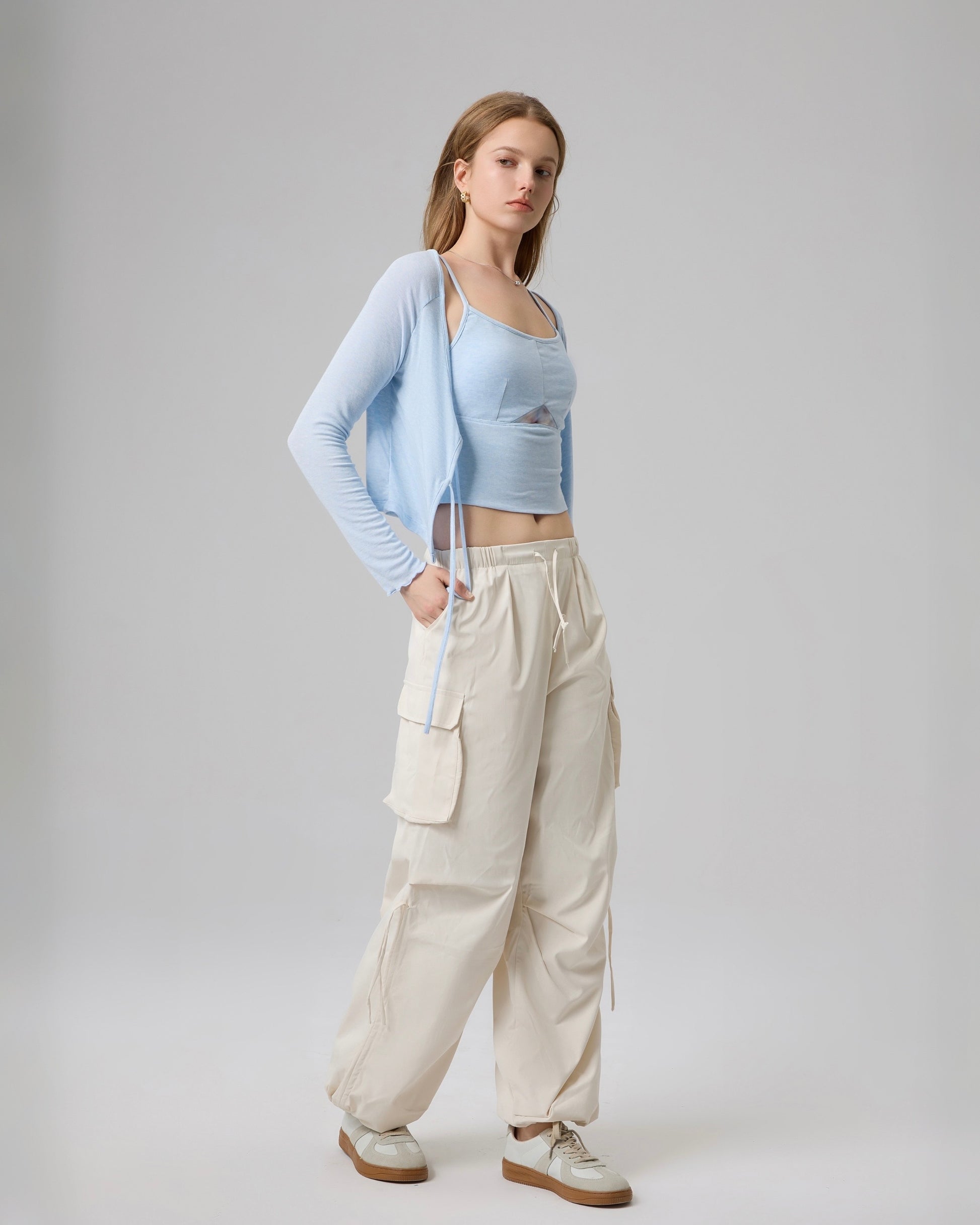 The Barely Built-in Bra Top is a knit crop top designed for soft support and delicate layering. With slim straps, a subtle built-in bra, and a sheer mesh panel below the bust, it feels like second skin with a sculpted finish. The crisscross back adds an elegant touch to this airy, icy blue essential.