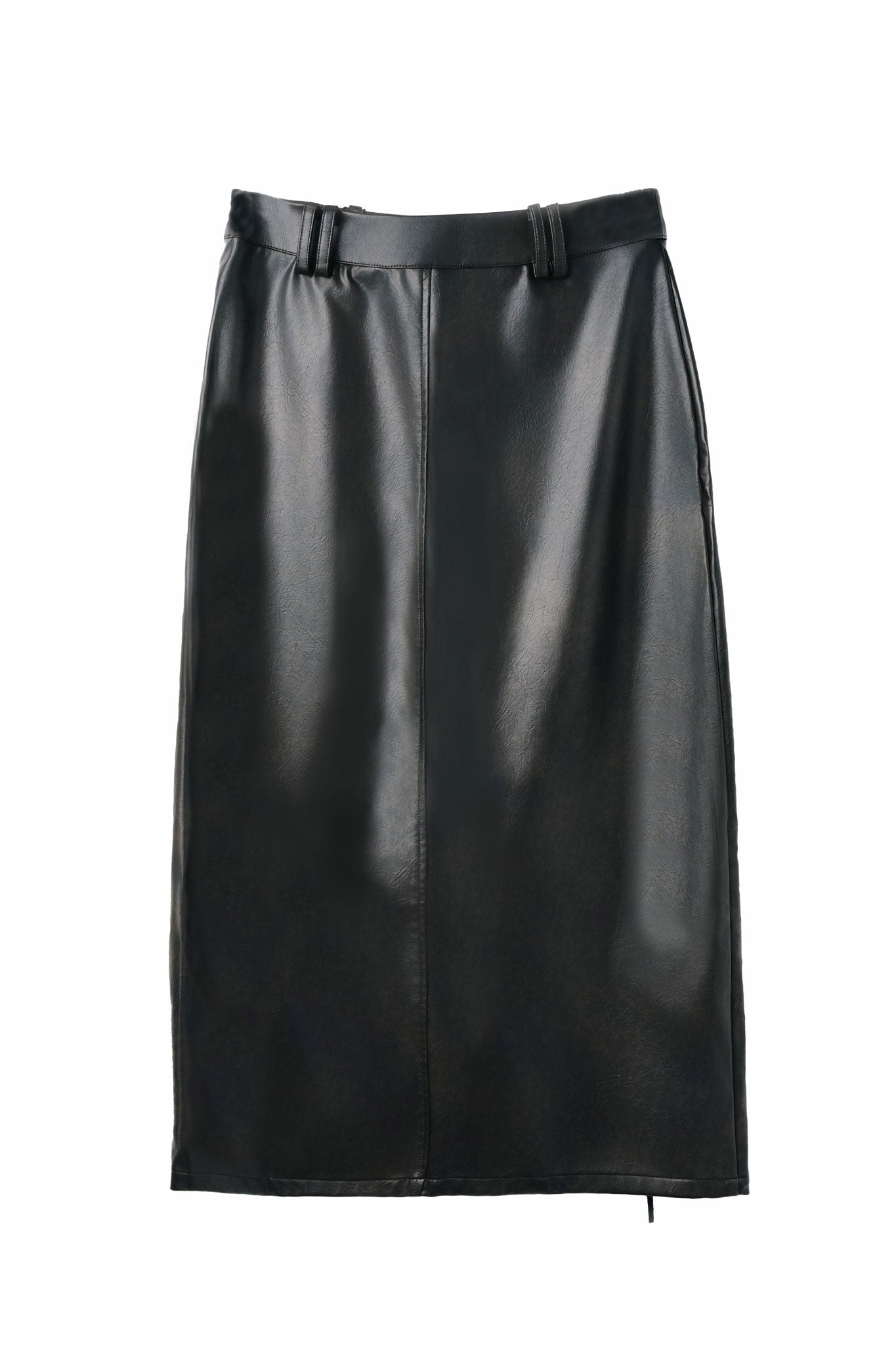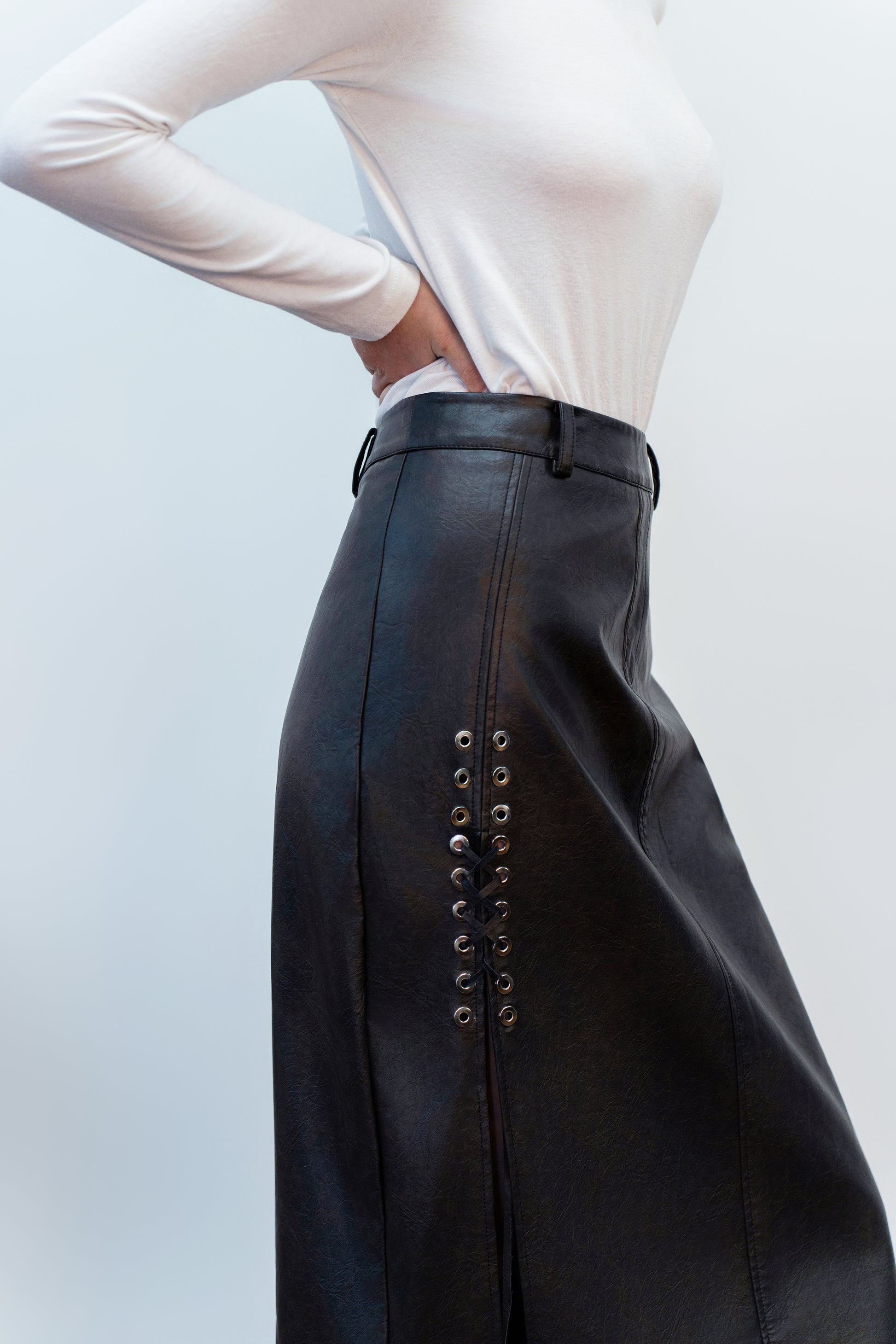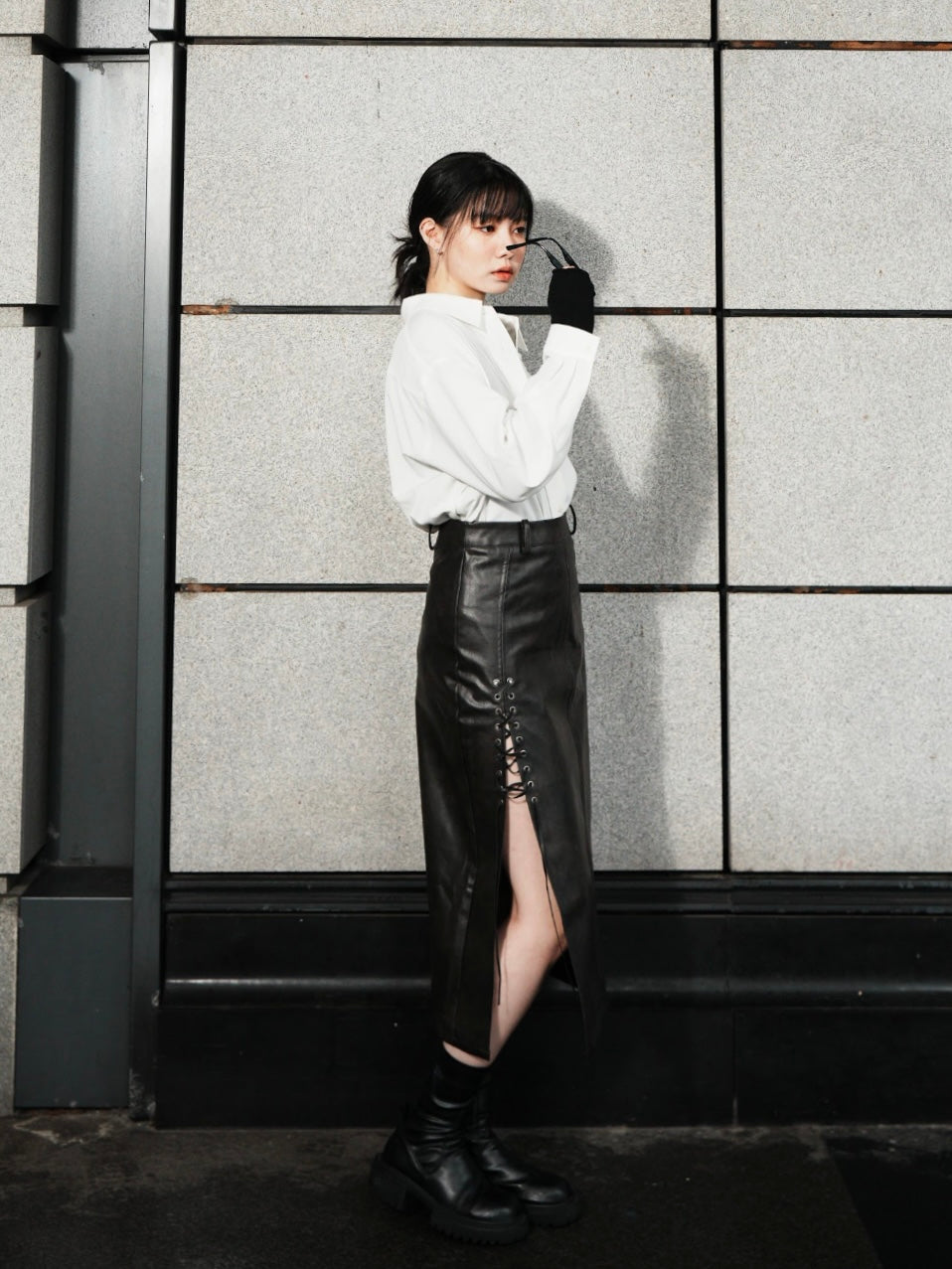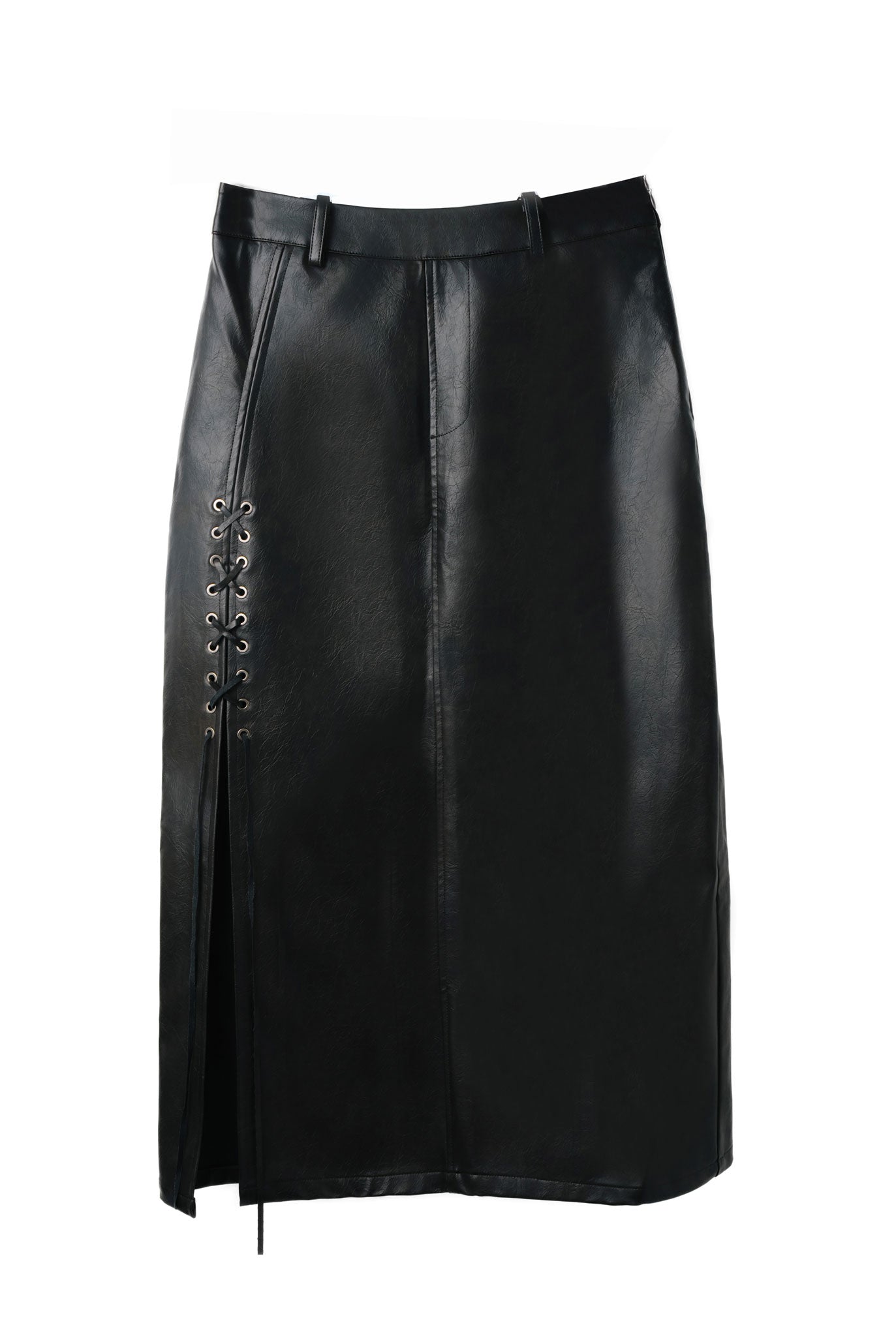 The skirt's synthetic leather construction boasts a meticulously crafted opening design on the wearer's right side, adorned with a rope elegantly threaded through metal holes. This striking detail adds a touch of avant-garde sophistication to its classic silhouette.