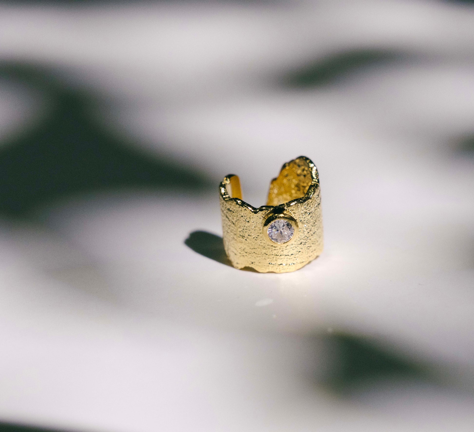 The Burnished Silver Ear Cuff, available in 925 silver and 18K gold-plated options, features a sleek, burnished texture with a single shimmering zircon stone. Its unique design wraps around the ear, adding modern sophistication with a touch of sparkle.
