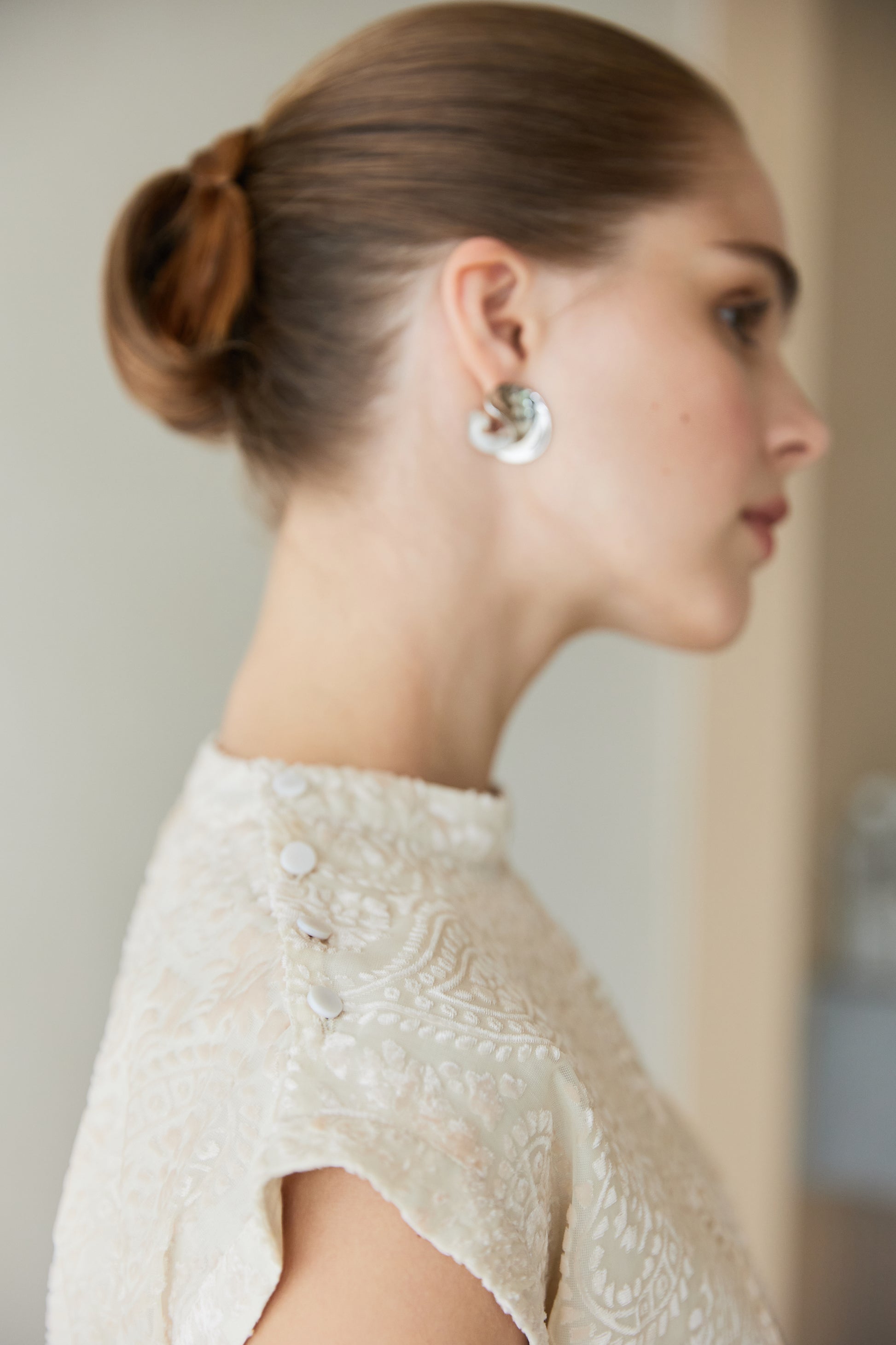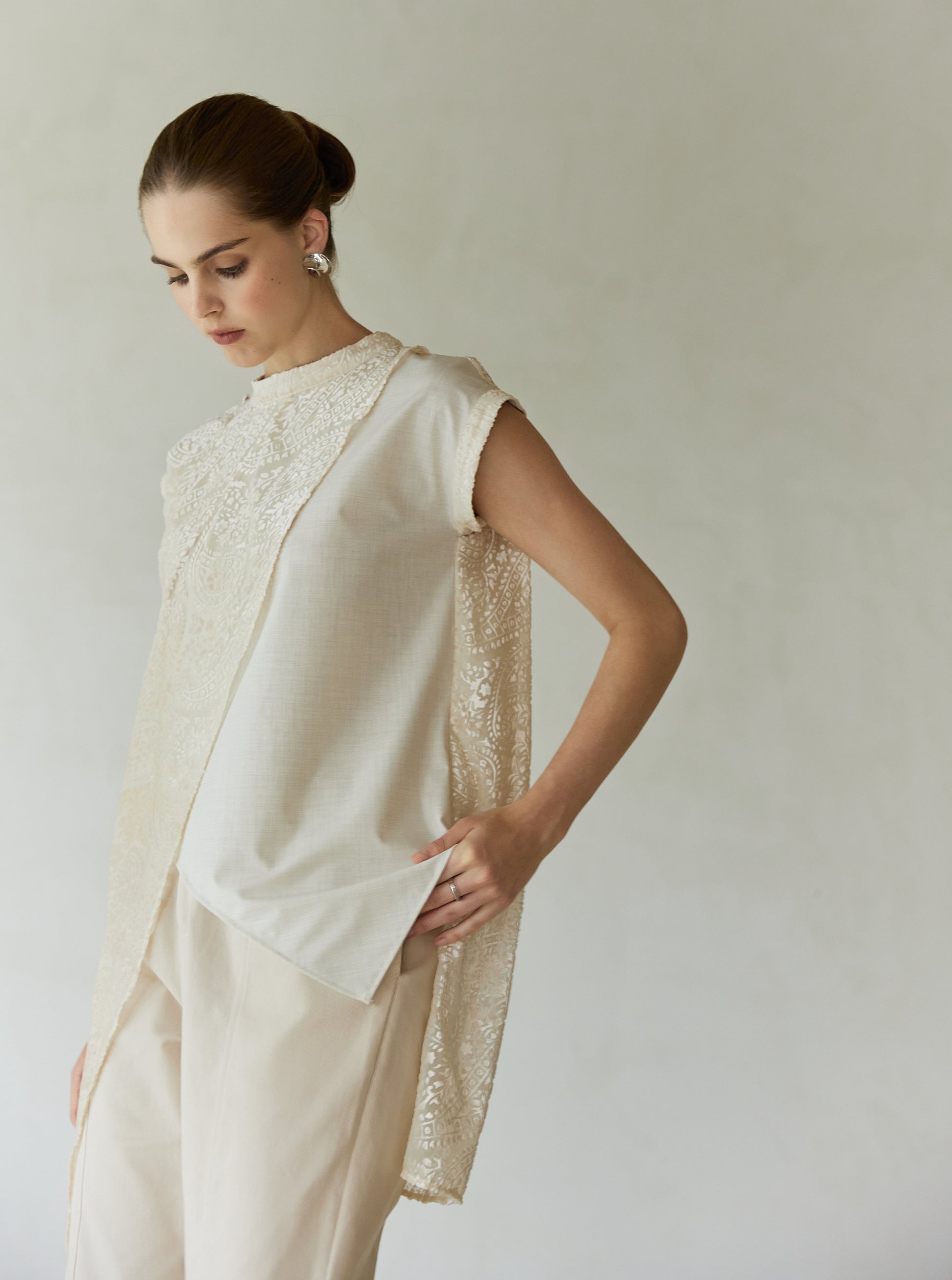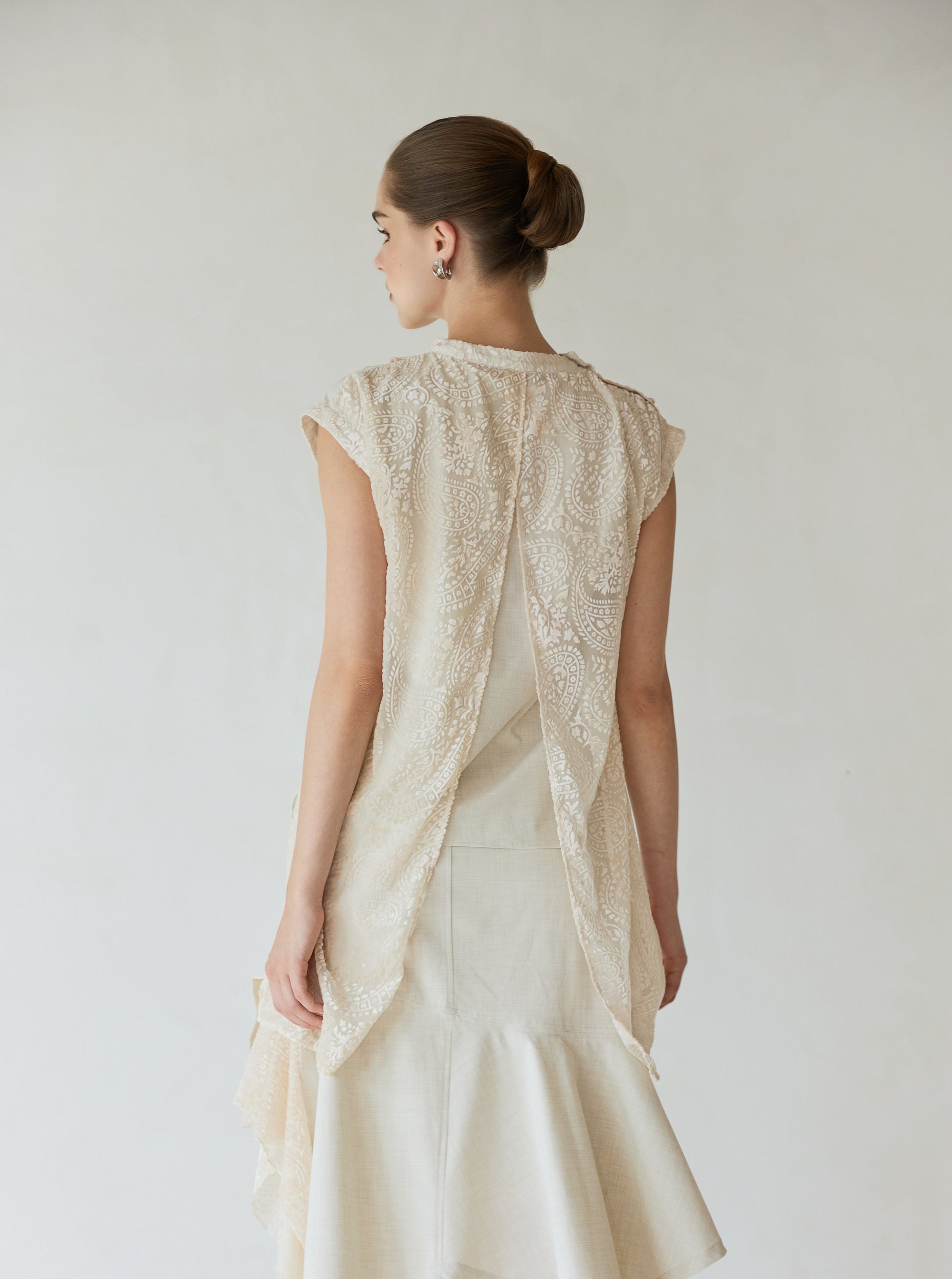 Introducing The Lace Longline Sleeveless Top in beige, featuring plush flocked lace layered asymmetrically for a modern and elegant look. This sleeveless top boasts a high neckline and a unique cross-back design, with buttoned shoulder details adding a touch of sophistication. Perfect for pairing with both light and dark-colored pants, or for a complete ensemble, match it with The Whispering Lace Maxi Skirt. This versatile piece effortlessly combines contemporary style with timeless elegance.