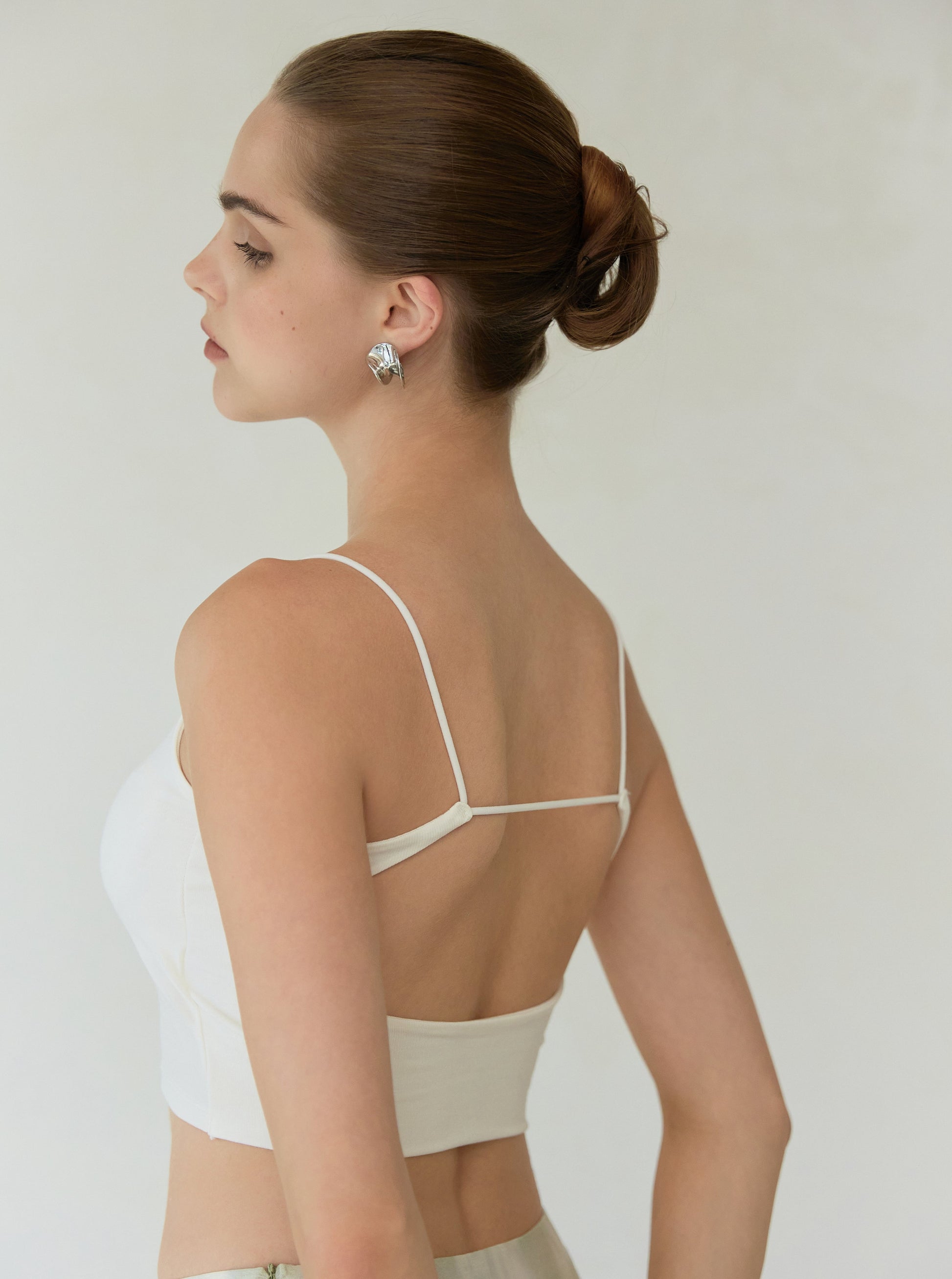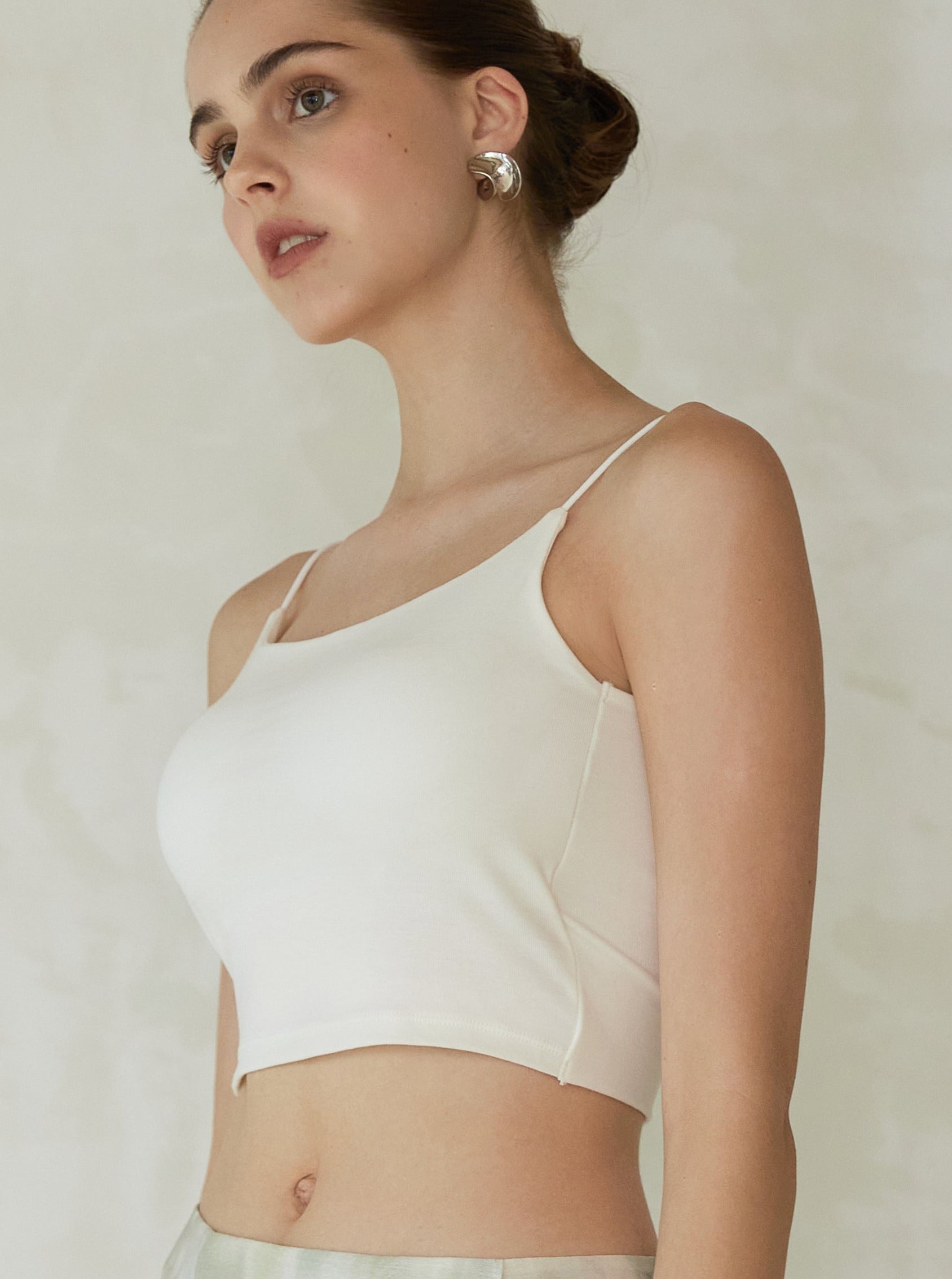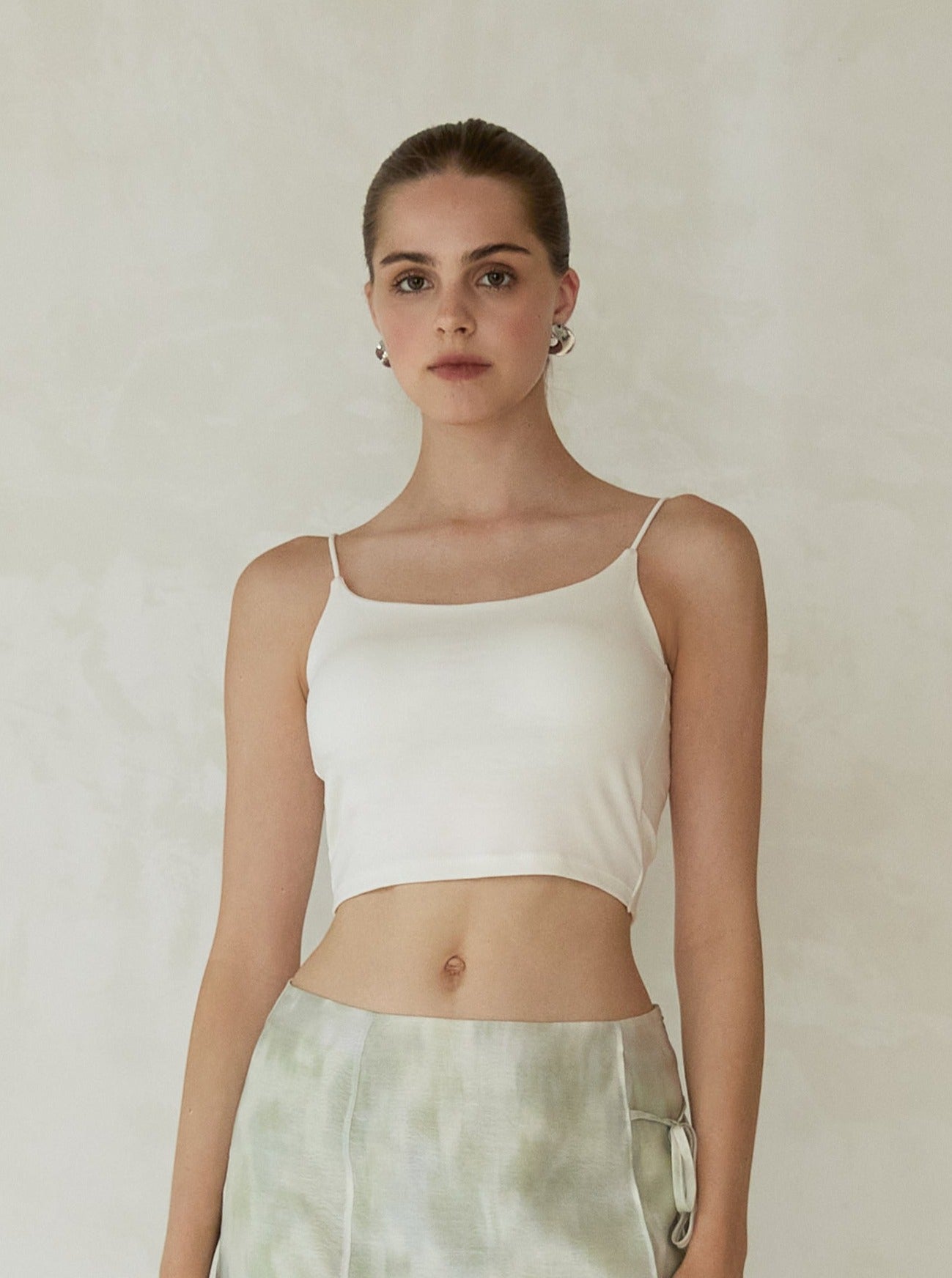 The Essential Bra Top is a stylish, cropped camisole perfect for warm weather or layering. This elegant white tank top features thin, adjustable shoulder straps and a unique back strap design for added flair. It comes with built-in cups, providing comfort and support. The minimalist design makes it a versatile piece for any wardrobe.