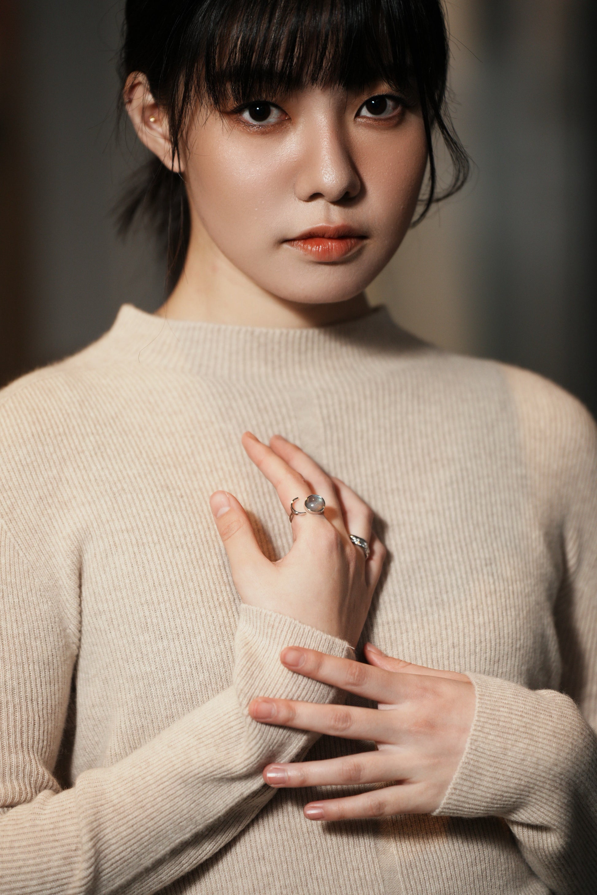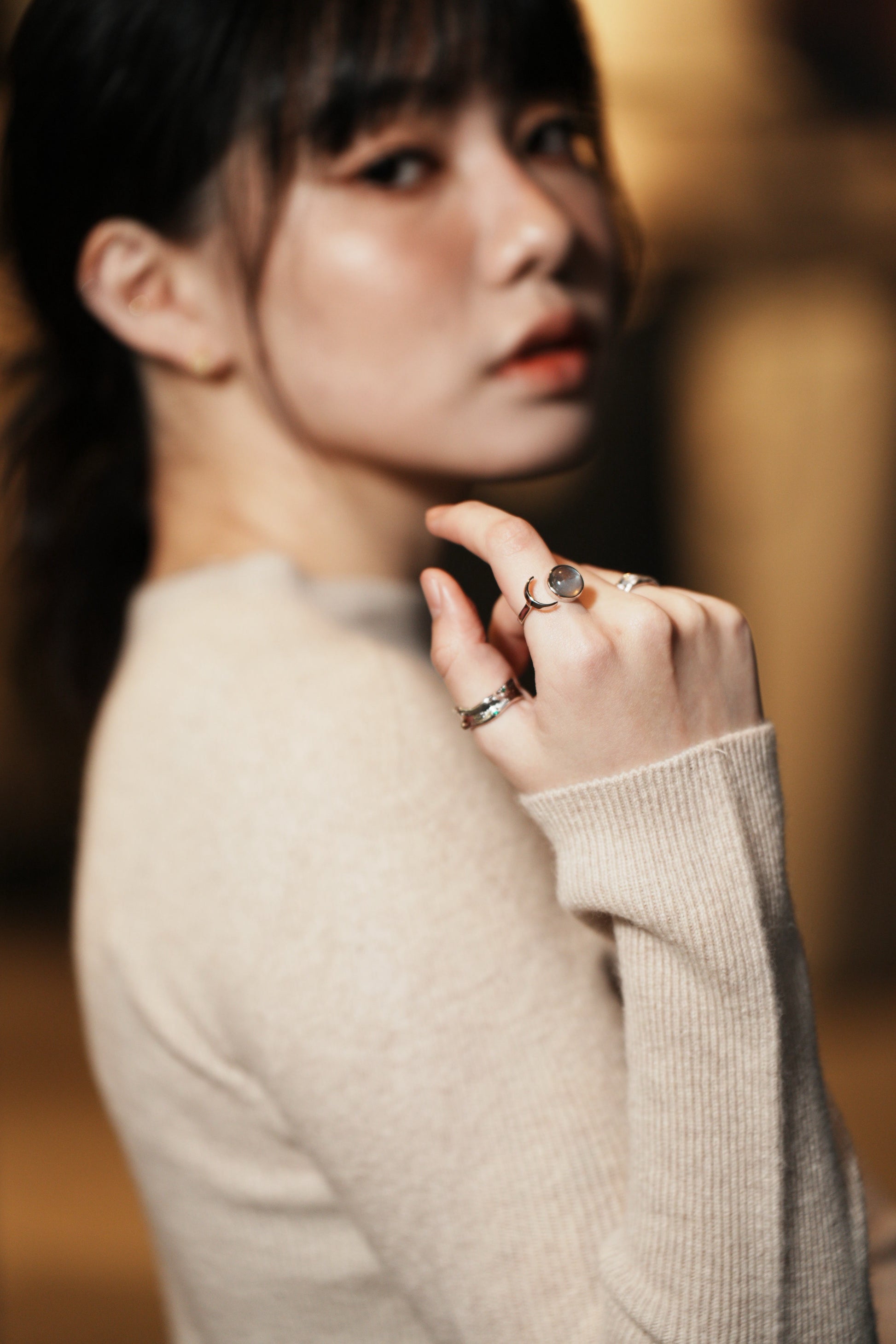 The Lunar Gleam Ring presents a mesmerizing harmony of celestial shapes and natural stone, featuring a circular grey labradorite on one end and a crescent moon shape on the other, artfully crafted in 925 sterling silver. The labradorite, known for its captivating play of colours, echoes the mystique of the night sky, while the silver crescent adds a touch of lunar magic. This open-ended ring is a symphony of celestial and earthly elements, offering a unique, adjustable design that beautifully wraps around the finger. Its enchanting aesthetic makes it an ideal piece for those drawn to the allure of the cosmos and the beauty of natural gemstones.
