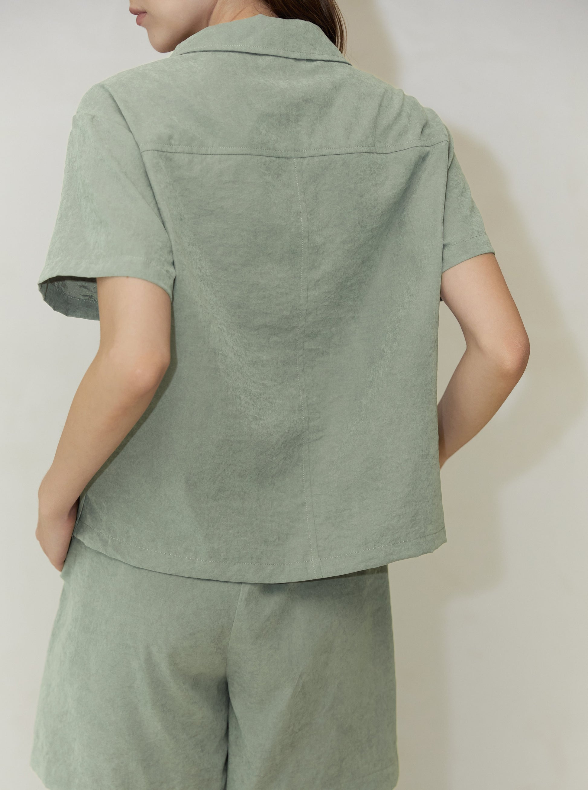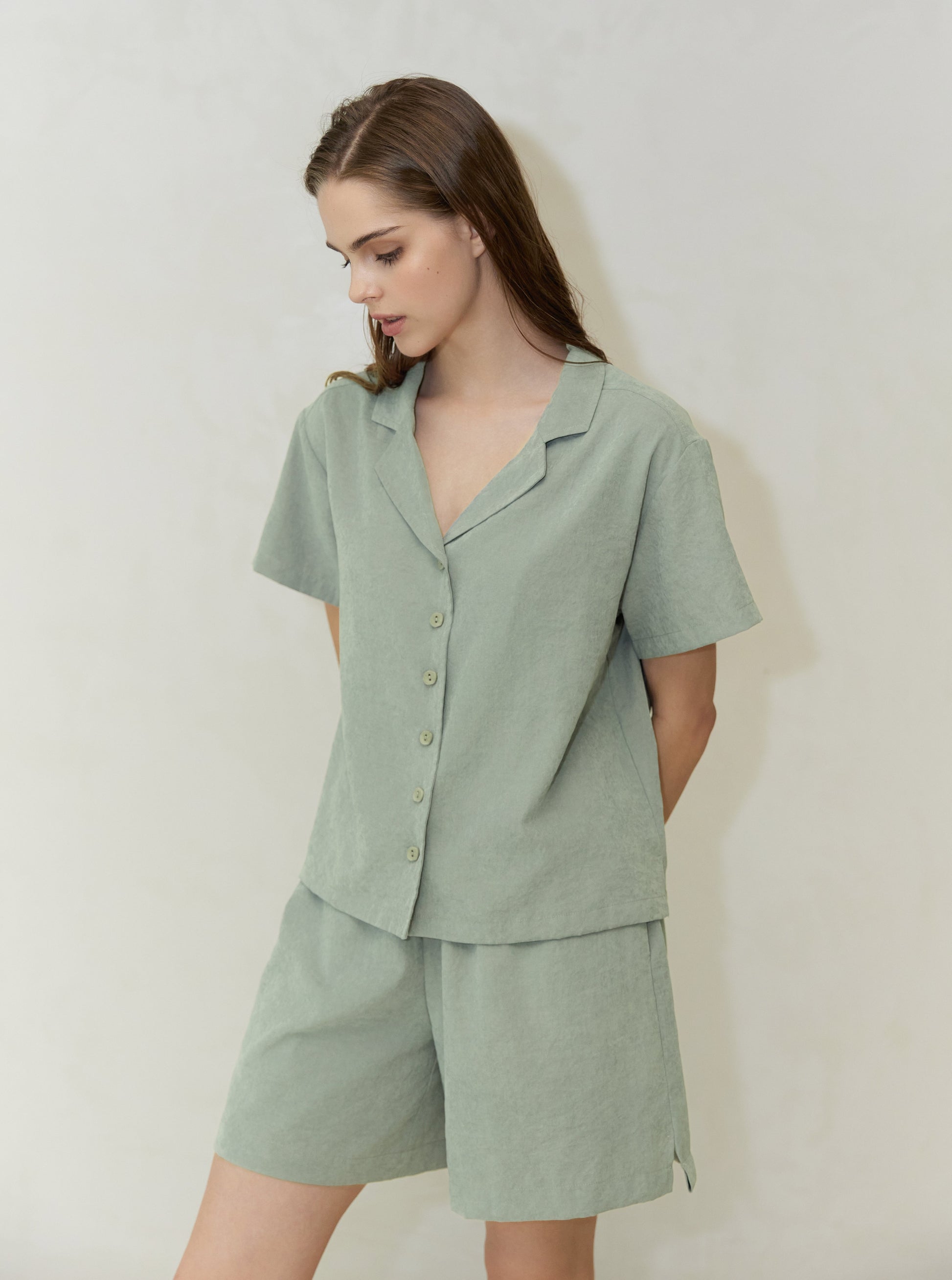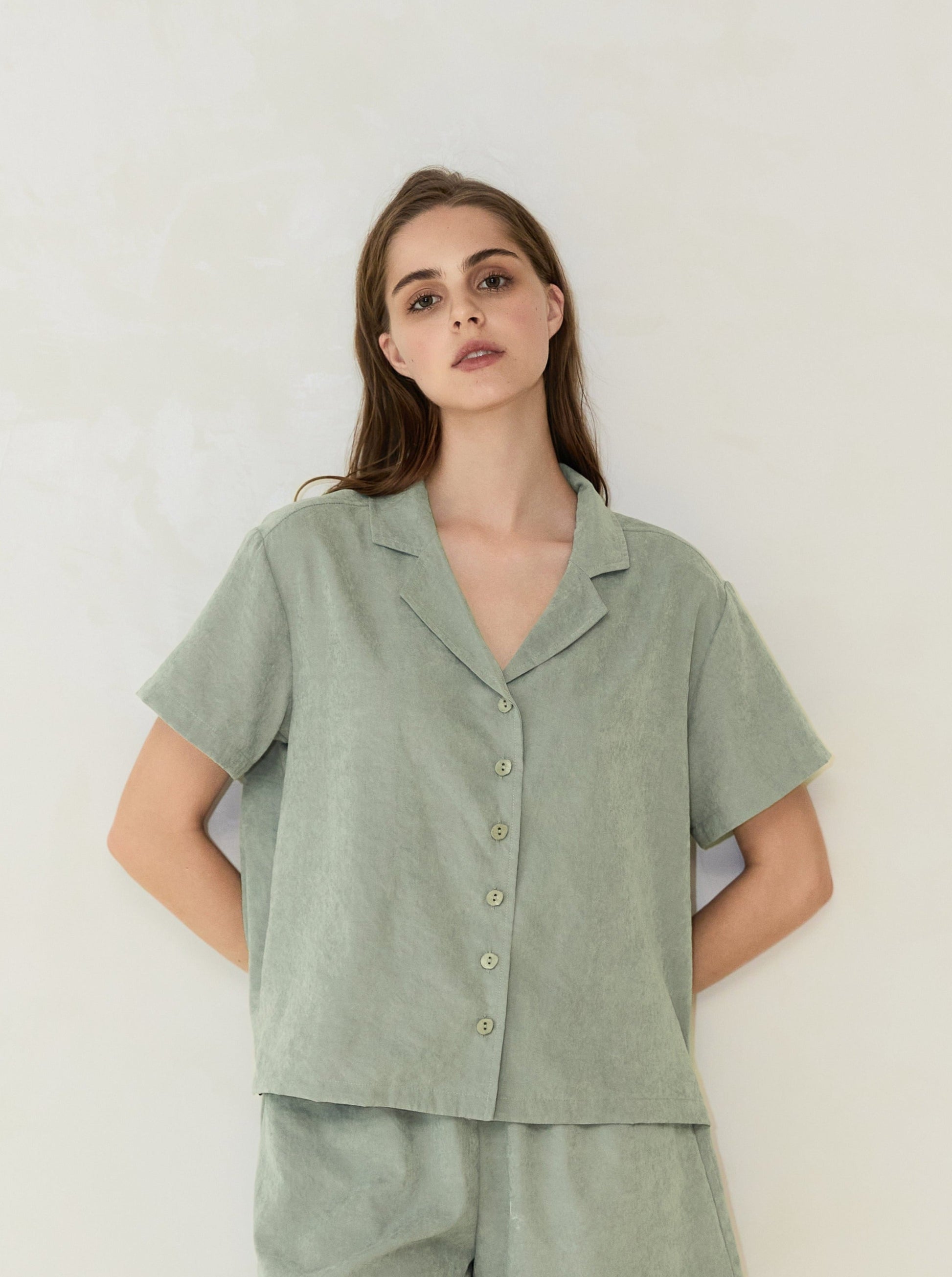 Introducing The Summer Comfort Shirt, a relaxed, off-the-shoulder shirt crafted from soft brushed fabric in silt green. This versatile top is part of a matching set that includes comfortable shorts, perfect for lounging at home yet stylish enough for casual outings. Available in two soothing color options: Silt Green and Ashely Blue, the soft green and sophisticated greyish blue hues are ideal for summer. Enjoy the comfort and effortless style of The Summer Comfort Set, designed to keep you cool and chic in any setting.
