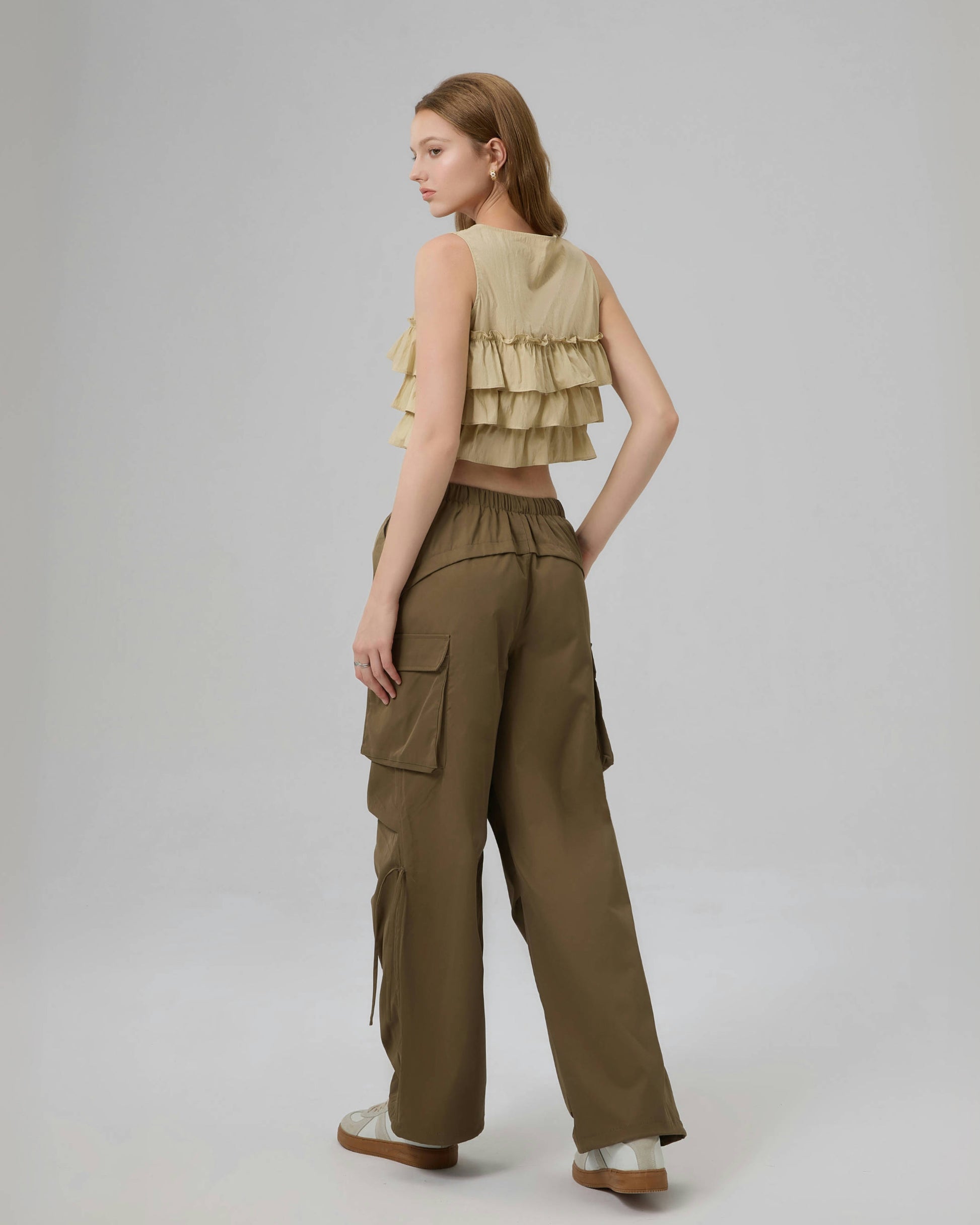The Urban Ease Cargo Pants combine utility details with a soft, fluid drape for a refined everyday look. Designed with an elastic drawstring waistband, adjustable ankle ties, and a side-calf drawcord accent, these relaxed cargos blend comfort and versatility. The back yoke and subtle sheen of the fabric elevate this easygoing silhouette.
