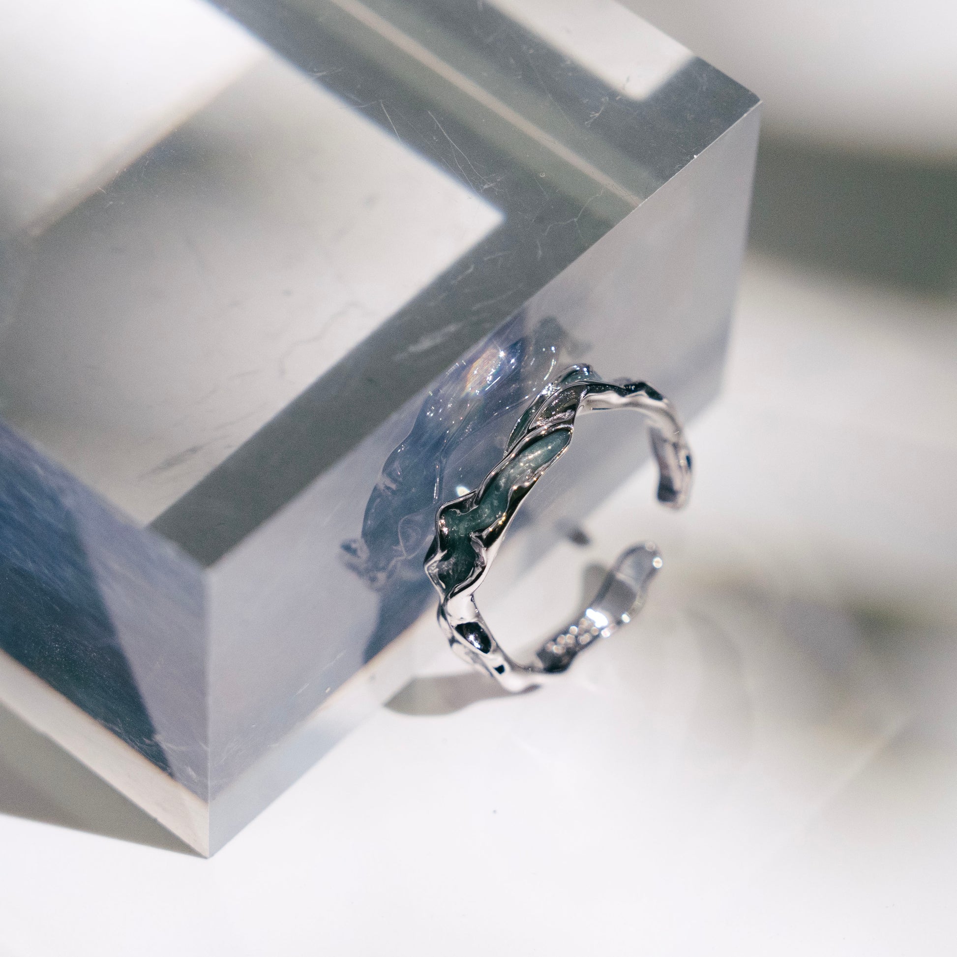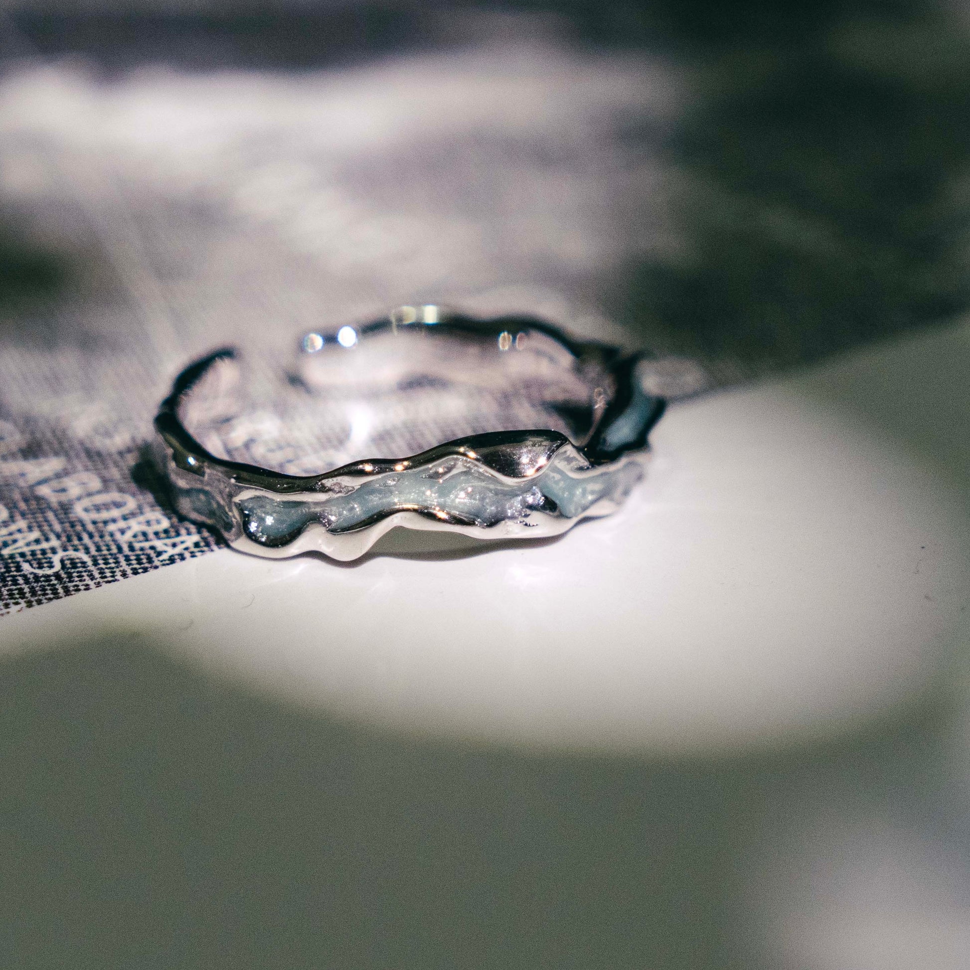 Made from 925 silver, this open ring features an artistic, irregular design that captures a sense of fluidity and movement. The wave-like enamel finish adds dynamic texture, making it a striking piece that balances elegance with modern flair.
